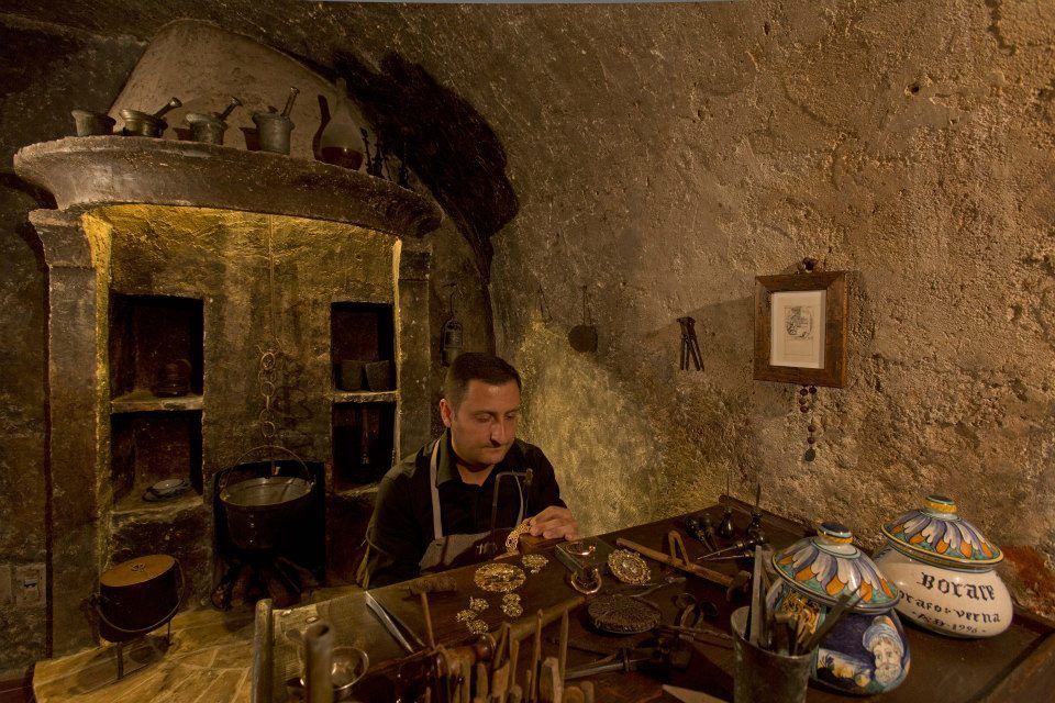 Nel laboratorio orafo si percepisce il profumo di un remoto passato: non siamo più in un museo ma in una vera bottega artigianale, perso in un tempo lontano. Lanterne d’epoca, che ampliano e riducono la loro luce rifrangendosi su un piccolo specchio concavo: forzieri pieni di monete antiche, utensili e vasi ovunque. Gli strumenti sono perfettamente funzionanti e